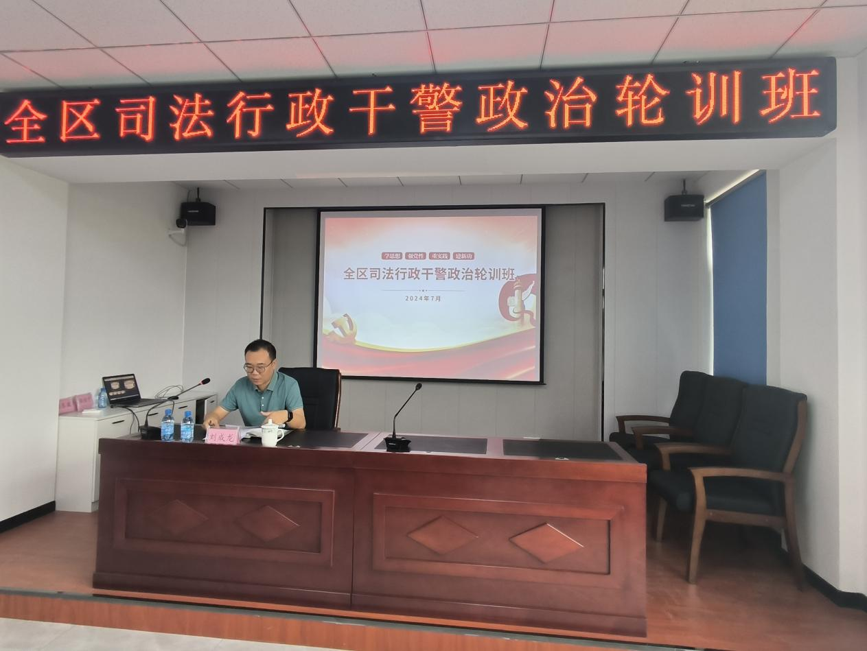 为加强政治建警,推进司法行政队伍“四化”建设,打造忠诚、干净、担当的政法铁军,7月3日至7月5日,区司法局举办全区司法行政干警政治轮训班,区人大常委会副主任、区司法局党组书记、局长司德胜参加开班仪式并讲话,局领导班子成员、局机关、区法律援助服务中心、各司法所工作人员以及派驻干警共38人参加培训。